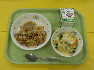 牛乳 ツナとコーンのピラフ フライドチキン アルファベットスープ ショコラケーキ