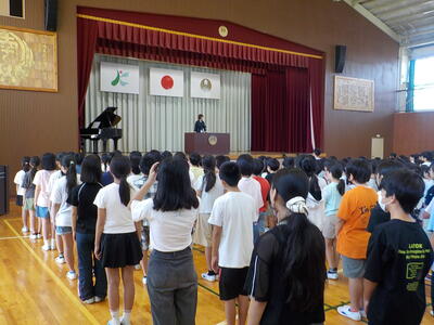 始業式の児童代表の言葉では、行事や学習で頑張りたいことが述べられていました。子どもたち一人一人が達成感や充実感を味わうことができる2学期となるよう、取り組んでまいります。