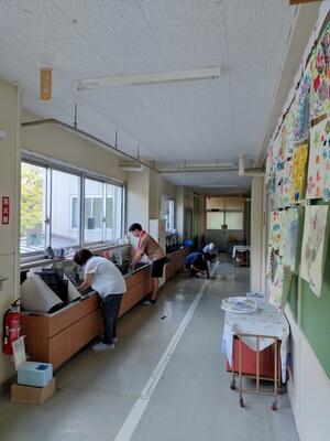 教室では、コロナ禍で使用していた水道前の足元のテープを剥がす、エアコンのフィルターの水洗い、扇風機のホコリ取り、窓拭き、普段児童だけでは清掃できない高所のそうじをしました。