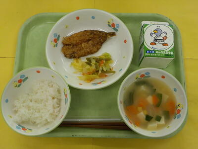 牛乳 ごはん いわしのかば焼き 茎わかめのあえもの どさんこ汁