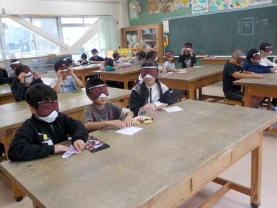 31日(金)3,4時間目の総合的な学習の時間に、福祉体験(アイマスク体験)を行いました。今回は、目の不自由な方のお話を聞いたり、アイマスクを着用しての折り紙や卓球を行ったりしました。また、ペアになり、アイマスクを着用した友達を誘導する体験も行いました。アイマスクをしていることで不安を感じたり、友達のサポートに安心したり、一人一人に様々な気づきがありました。
