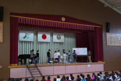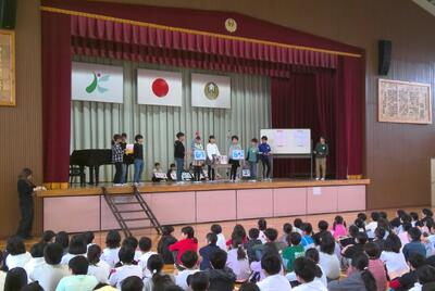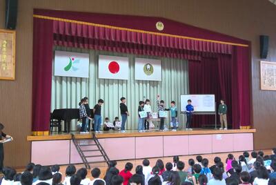 15日の朝の活動では、計画委員会の児童が中心となって、群決め集会を行いました。本校の特色である「縦割り班活動」のもととなる群を、各学級の代表児童が色玉をひいて決めます。児童は、今年は赤群、青群のどちらになるか、ワクワクしながら注目していました。
